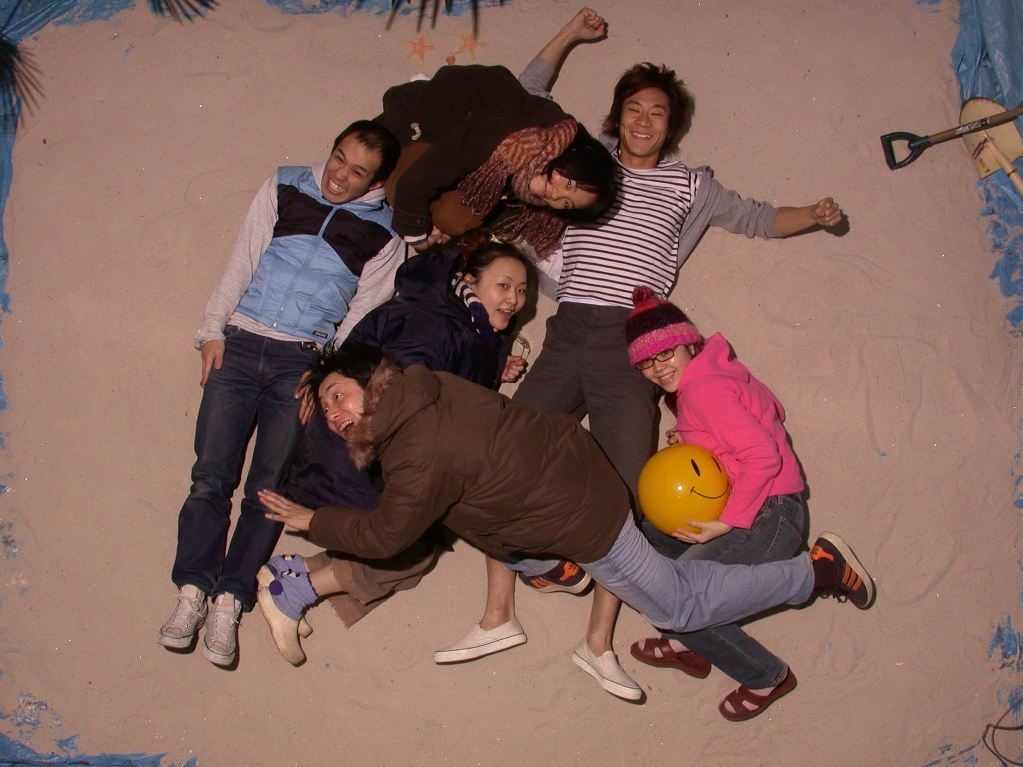 KAKUTAの毎年恒例である花見大会は、代々木公園で夕方から明け方まで行われます。寒いので、大抵桜が散ってから花見をしています。というわけで、誰一人桜を見てません。この年は去年かな?まだ若干桜が残ってますね。