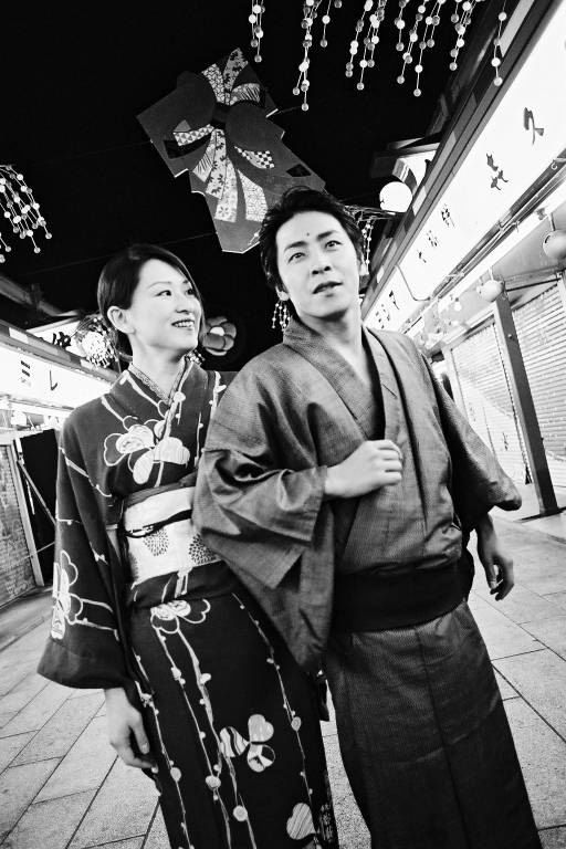 浅草仲見世通りで撮影。高山は良い女っぷりを、成清も男前ッぷりを発揮しています。着物を着ているだけなのに二人ともスジもんな匂いがしますね。