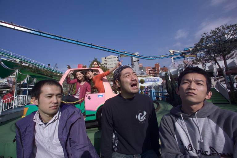 宣伝写真として正しいのでしょうか。手前の男たち、誰一人楽しそうじゃありませんが。こんな男たちで遊びに来たのか、想像するのも難しいです。後ろで間違い探しのように大枝と佐藤陽子がいるのも、変な感じ。